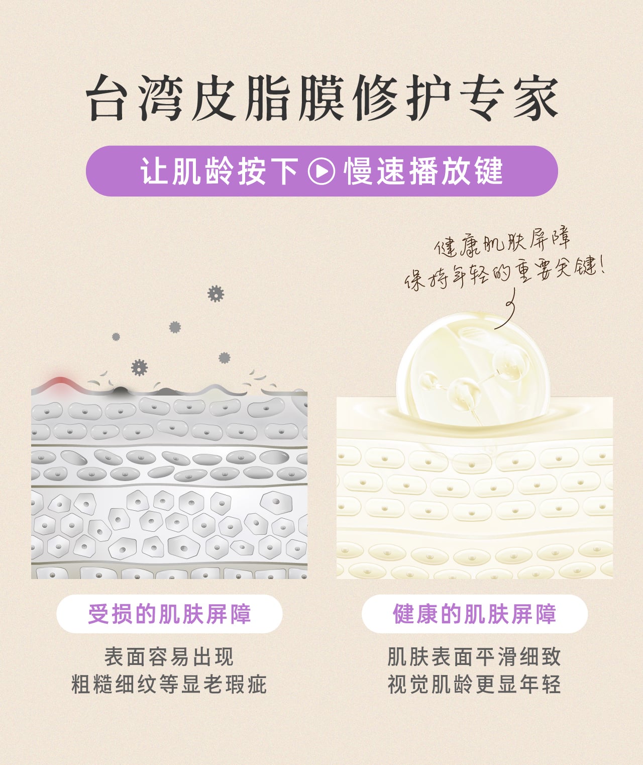 皮脂膜是皮肤的屏障,能帮助抵禦外部的刺激,同时也是皮肤中,最重要的一层锁水屏障,当皮脂膜受损时,会感到乾燥甚至是脱皮、乾痒、泛红、粉刺痘痘、毛孔粗大等局部敏感。不正确的卸妆、长时间带妆、天气变化、紫外线、环境汙染都会造成肌肤受损。