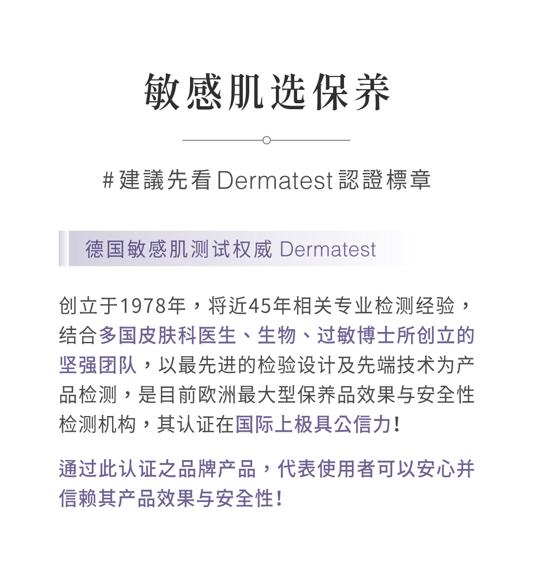 Dermatest 是欧洲最具权威的皮肤科检测机构,专业评估产品对肌肤的安全性与耐受性。