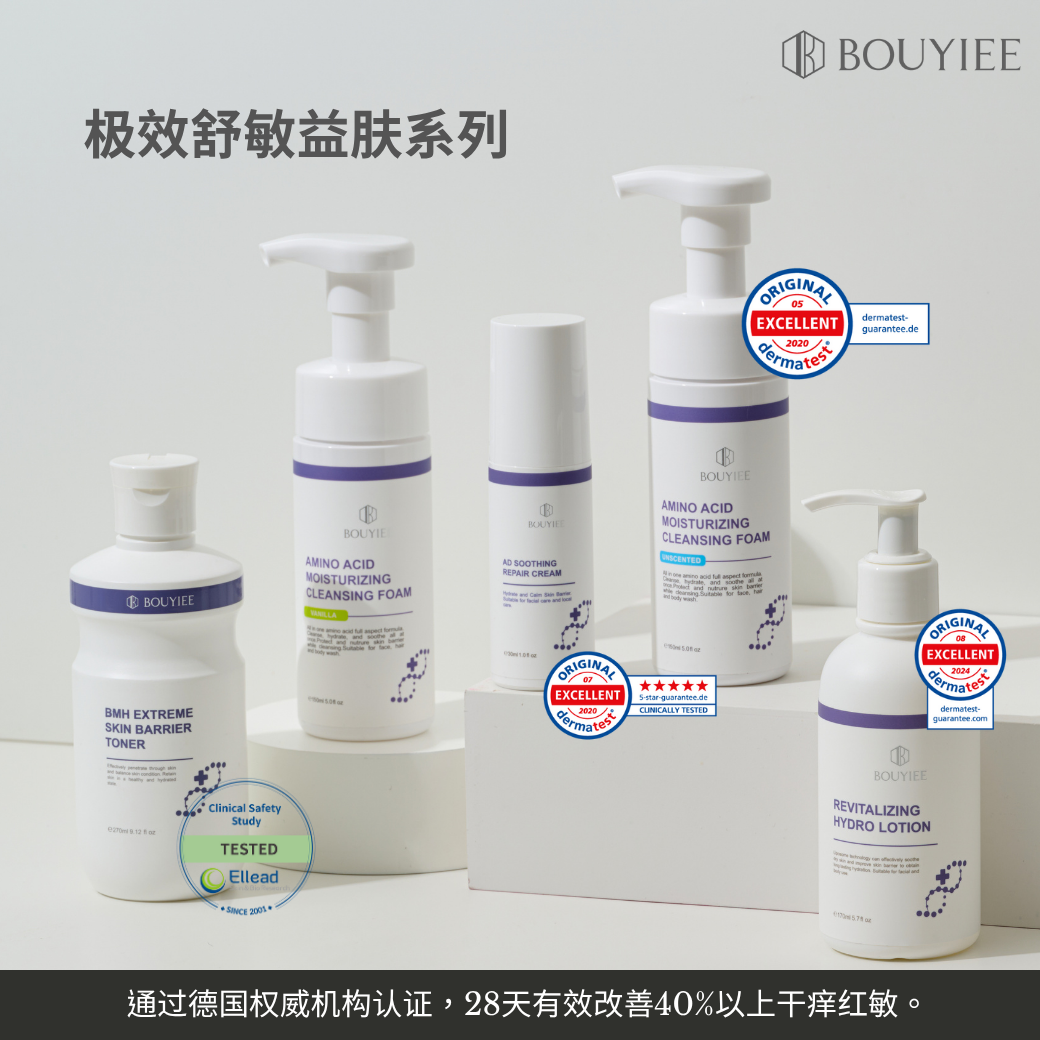 BOUYIEE德国DERMATEST舒敏益肤系列通过严格德国肌肤测试,专为敏弱肌肤设计,温和无刺激,有效舒缓泛红、乾痒、不稳定肤况,帮助修復肌肤屏障,全肤质皆可安心使用。